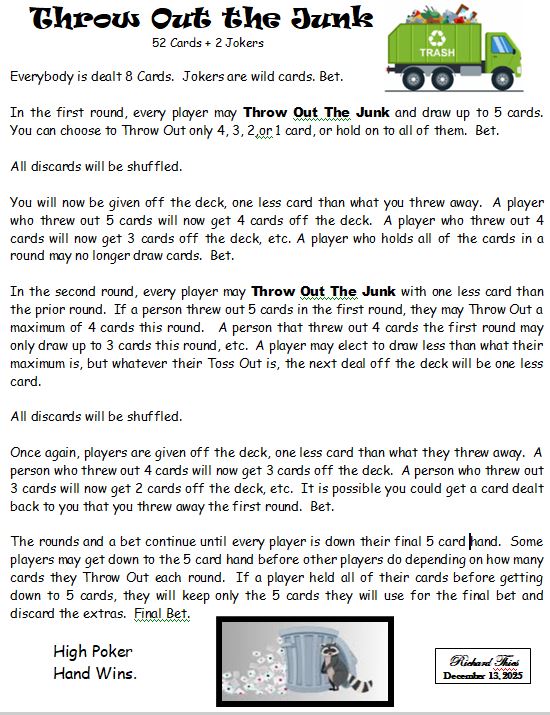 Here are some of the poker games we have invented over the years. A few of these have also been stolen from other players or taken from internet sources.. These pages are intended as a guide because the rules tend to get tweaked and clarified as the players get more familiar with the games.