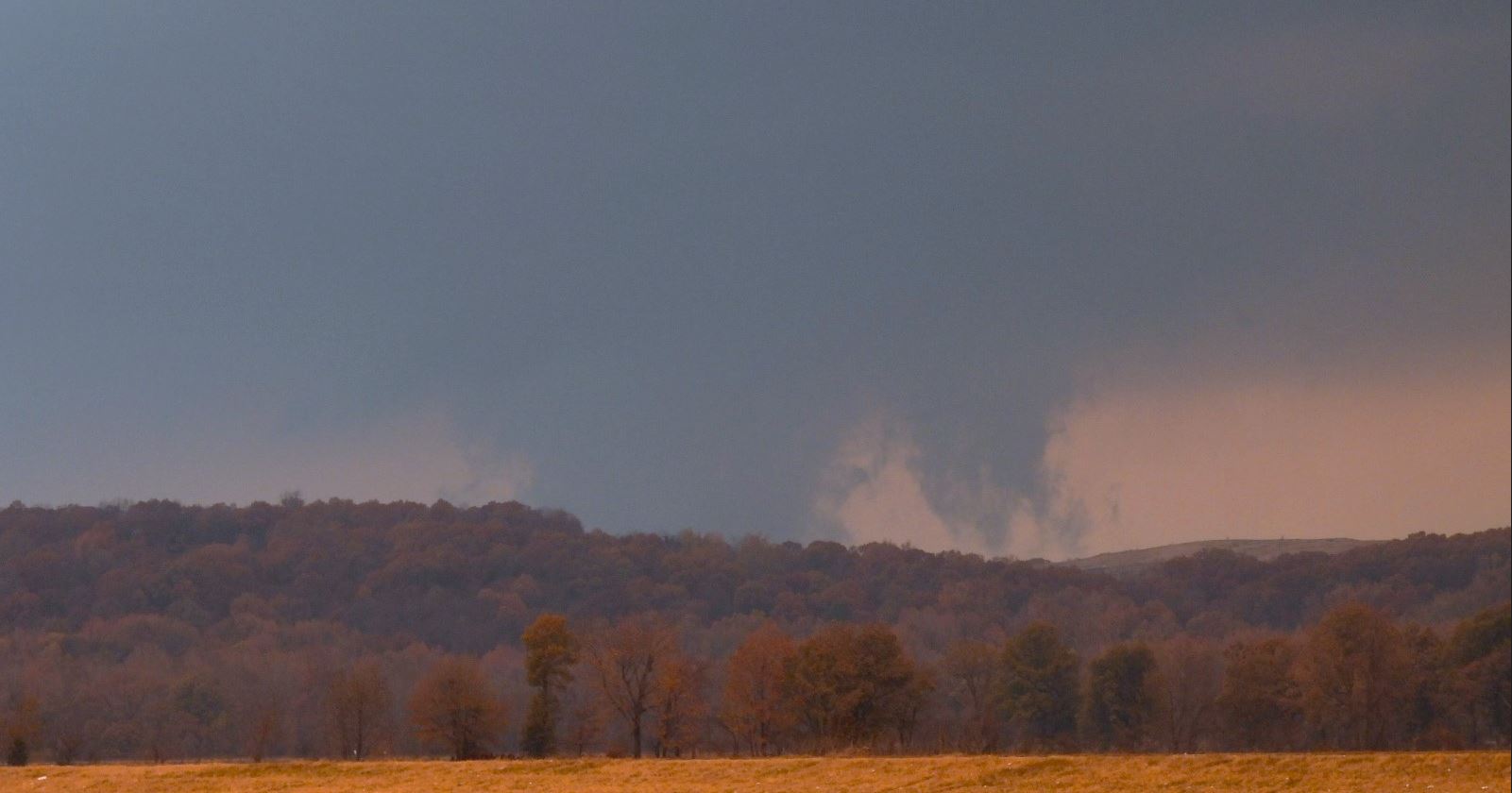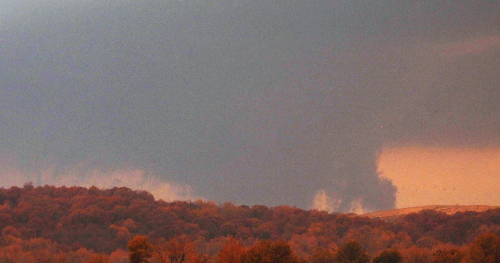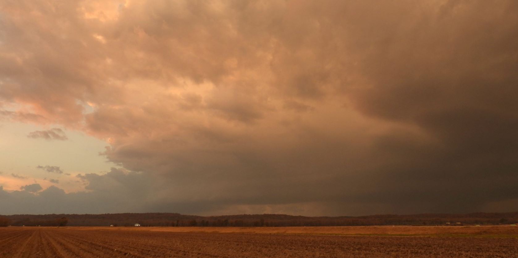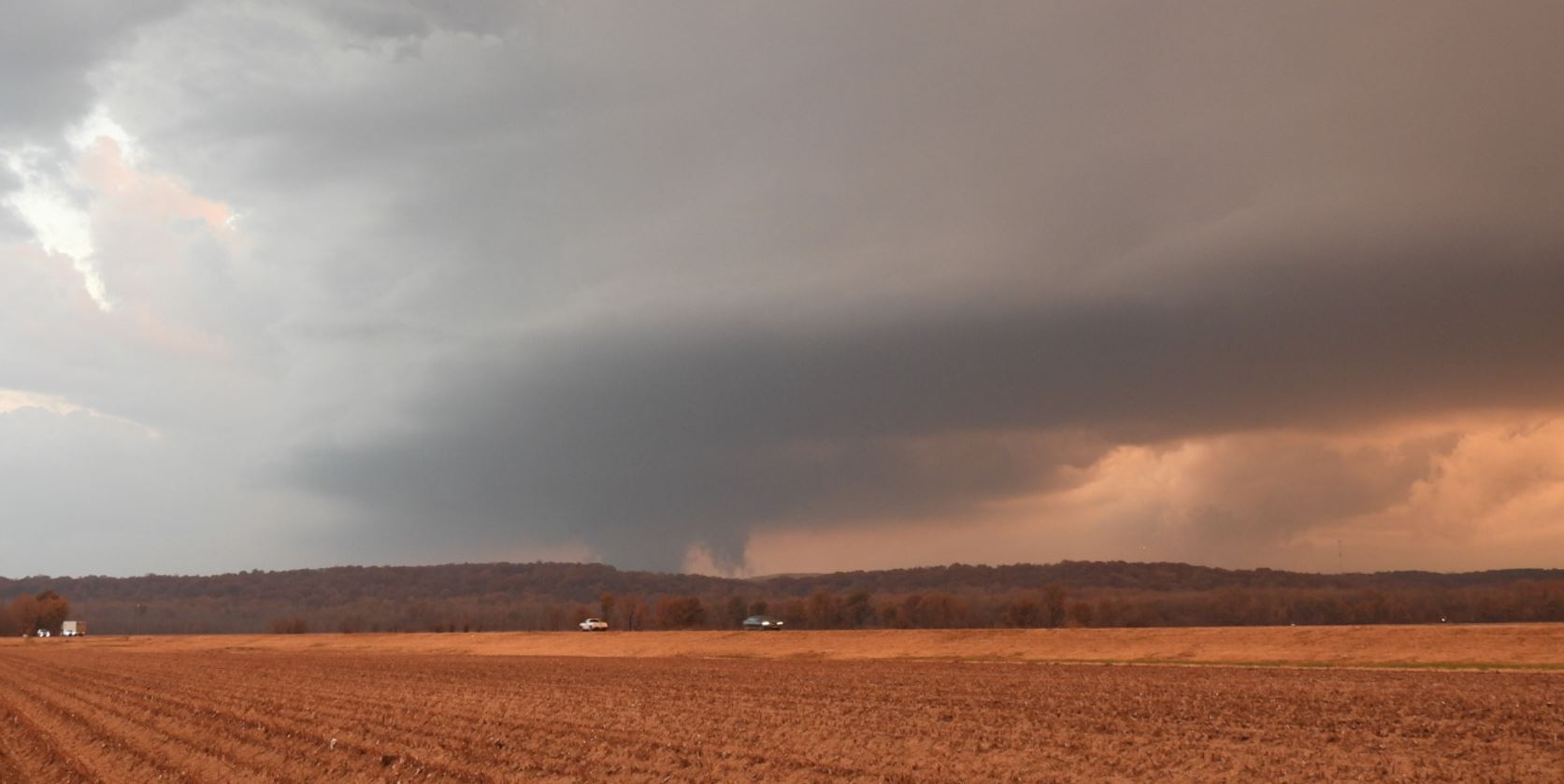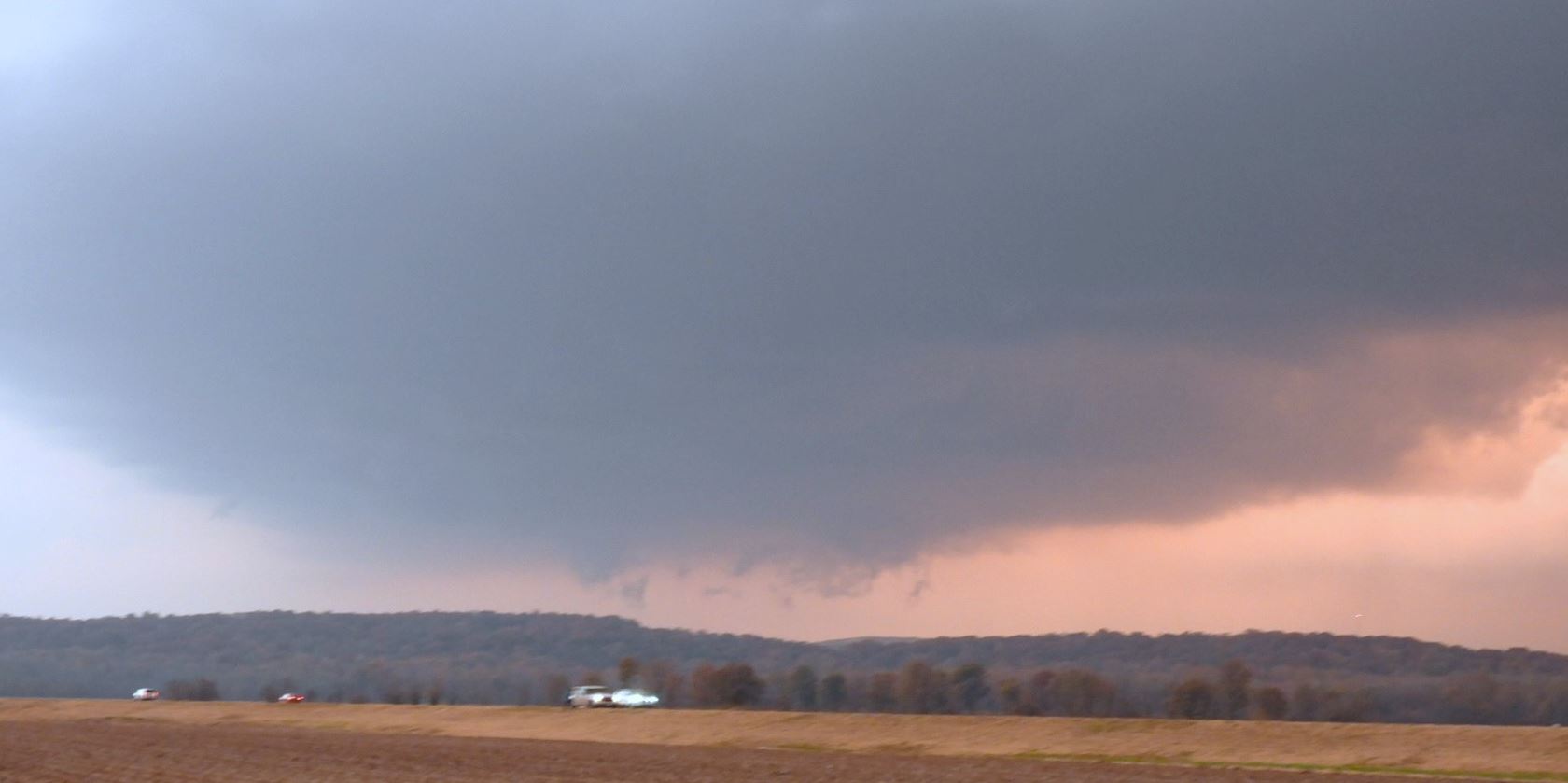 As we reached Dexter, we chose to push a bit more east to Essex, Missouri out in the flat, flood plain to watch the storm come toward us.  As the back end of the storm came into view over the hilltop, we took note of a lot of lowerings and movement under the wall cloud as we watched.