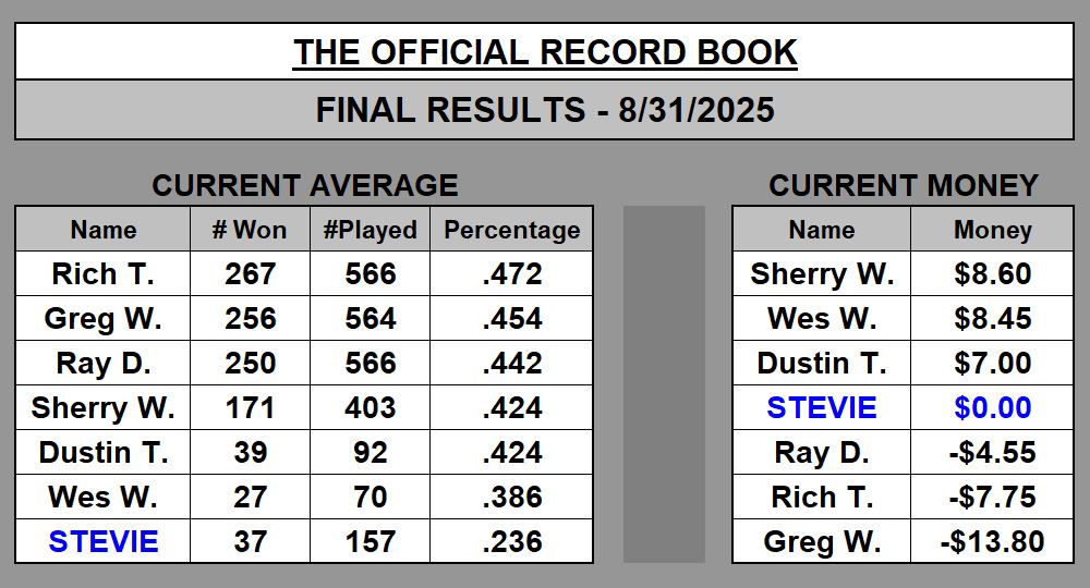 Greg, Ray, and Rich finished the season with nearly the same average while Rich controlled the money leadership with Ray at the bottom of the money list. Greg's money total was just above zero on the positive side.