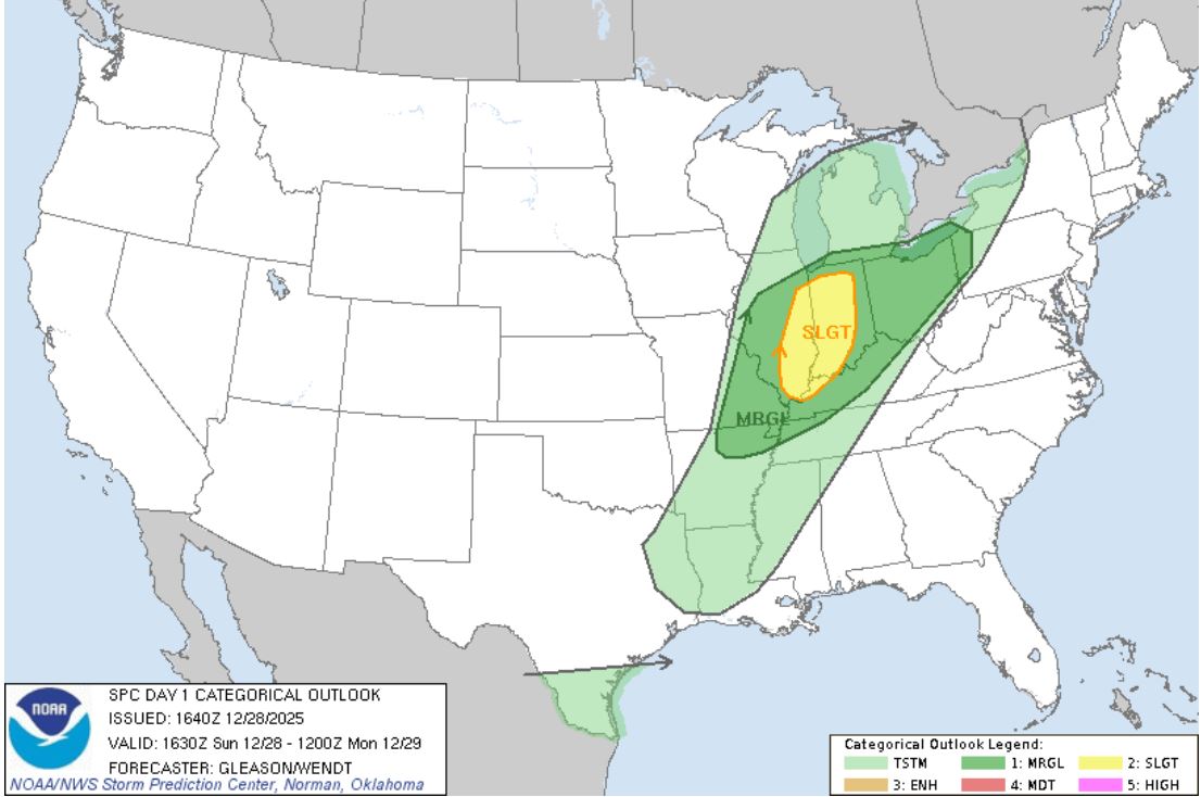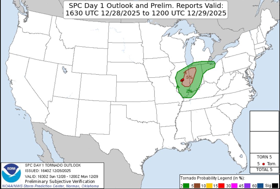 A late December storm chance was in the cards today.  My son Ryan and I decided to make a wildlife trip out of the day and if things looked interesting as storms developed, transition into the storm mode.  The Tornado opportunity looked to be slim as the storms were forecasted to initiate late in the afternoon toward dark, then would quickly transition into a squall line, were lacking several key ingredients, and were moving at 50+mph.   The Storm Prediction Center put out a Slight Risk with a 5% Tornado Risk.